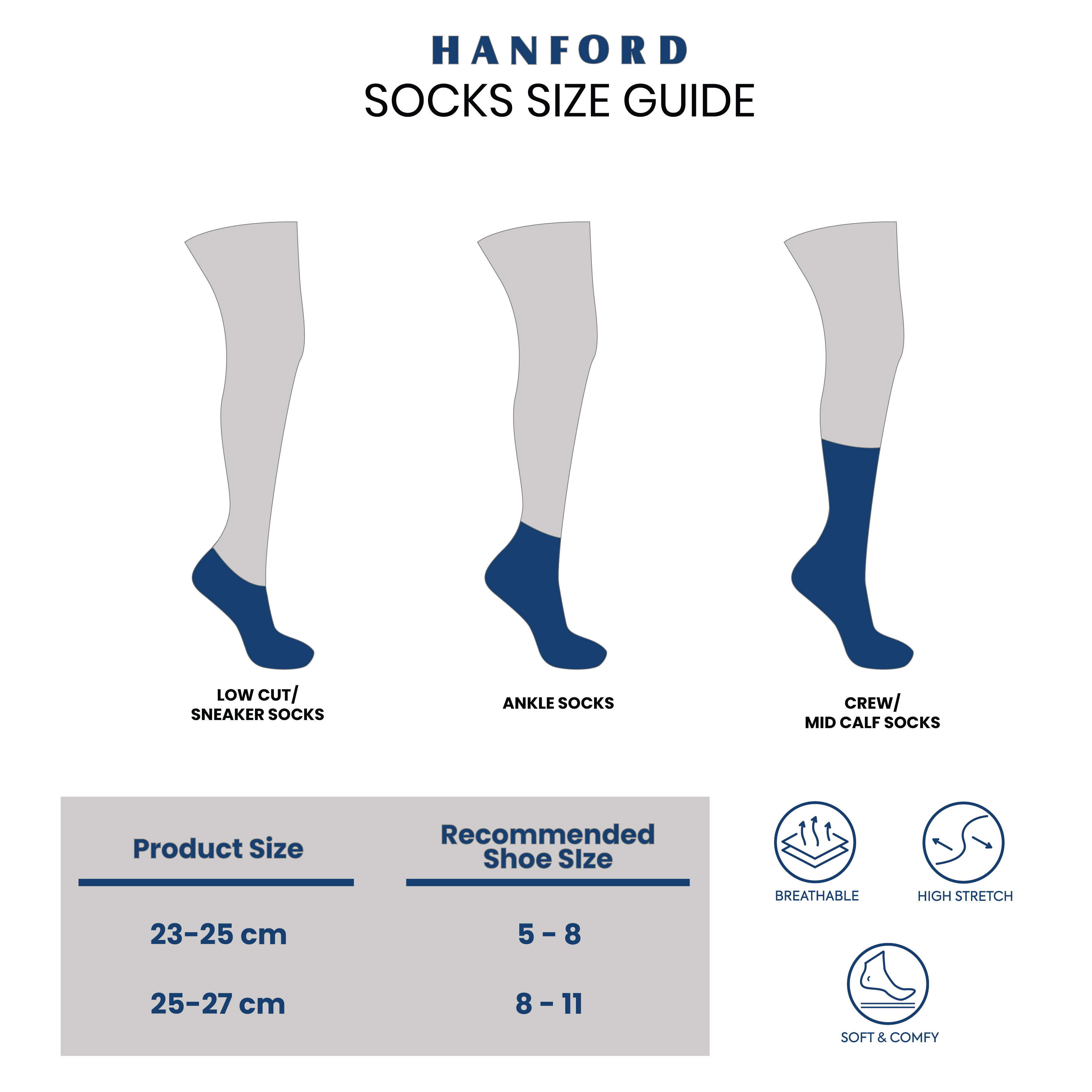 Hanford Unisex Casual Everyday Comfort Cotton Socks are constructed with a premium blend of 70% cotton, 27% polyester and 3% spandex for easy fit, stretch, and added durability.